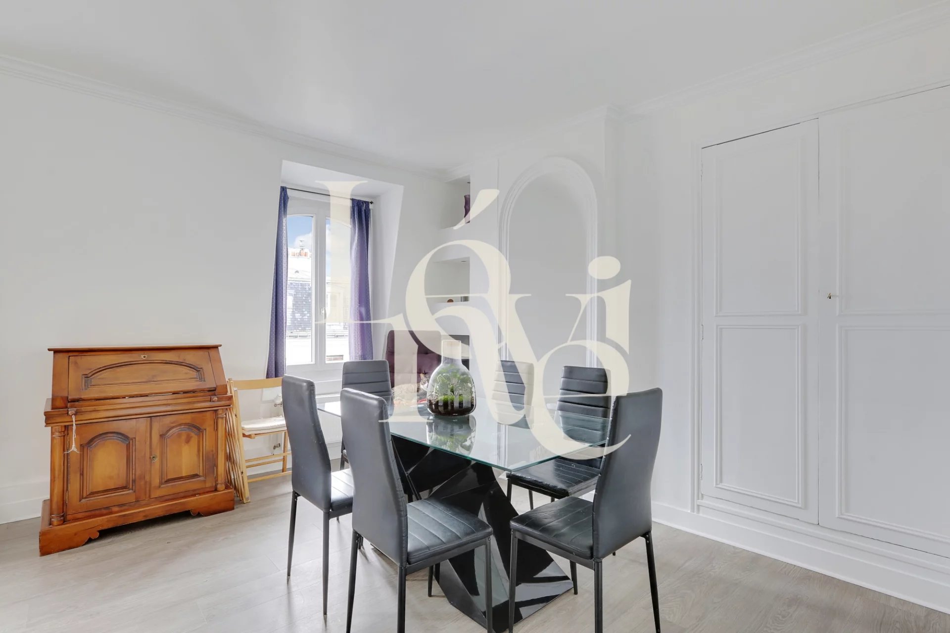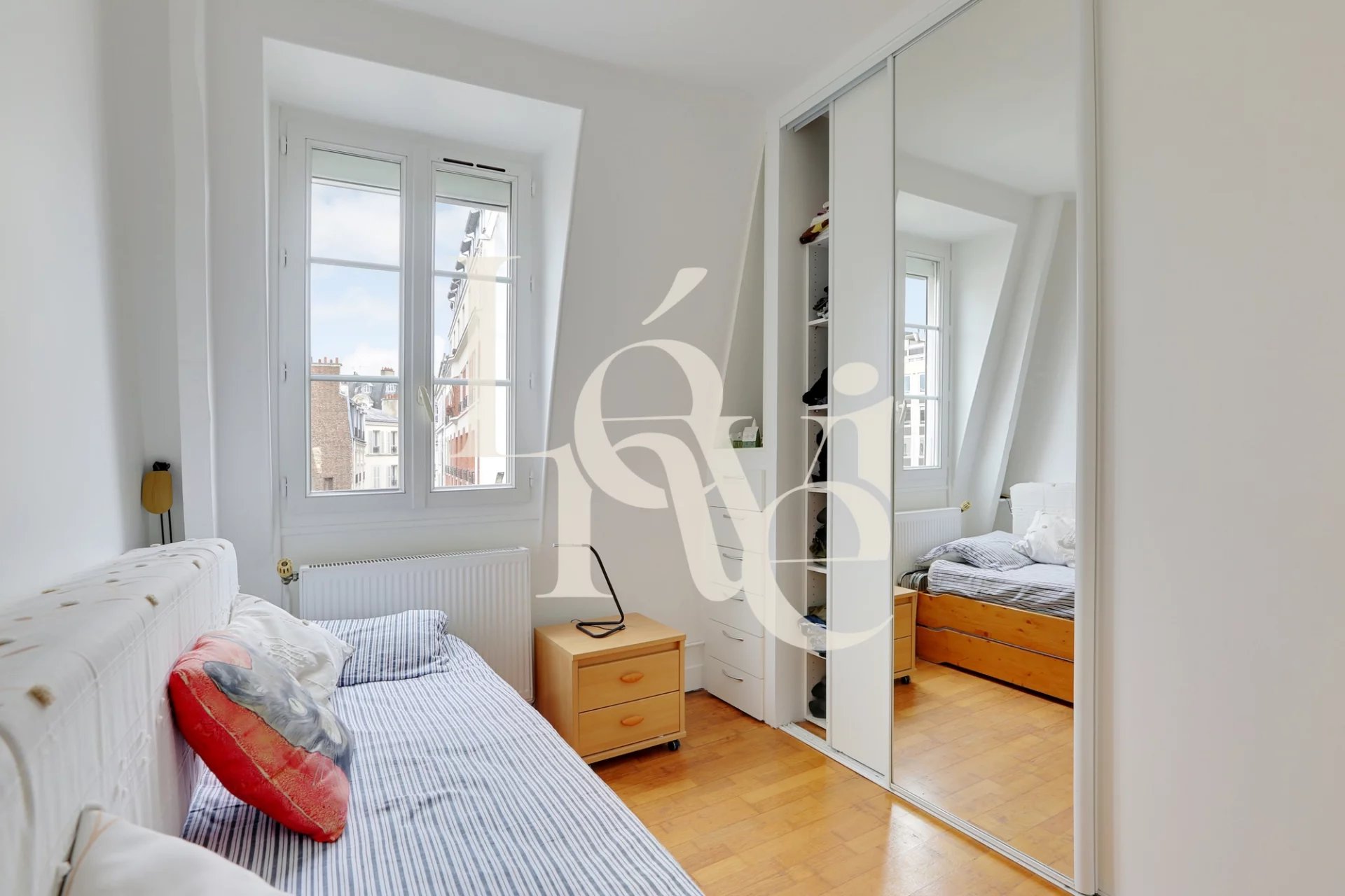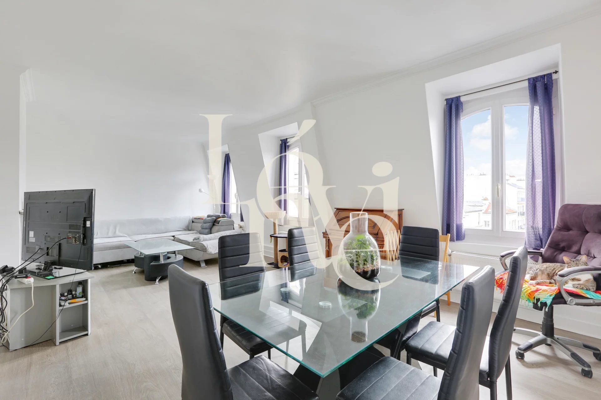 L’appartement se compose d’une entrée, d’un beau séjour exposé plein sud offrant une vue dégagée sur le ciel et les toits, d’une cuisine séparée et équipée, de deux chambres, d’une salle de bain et d’un WC indépendant