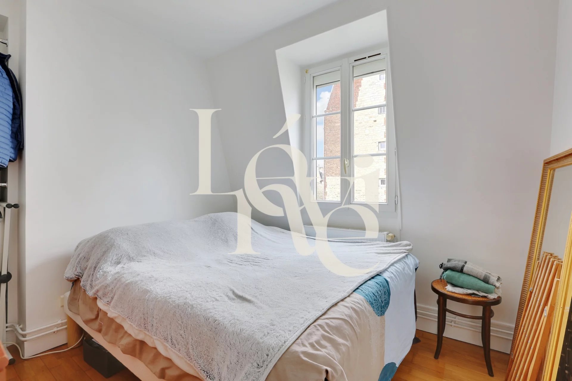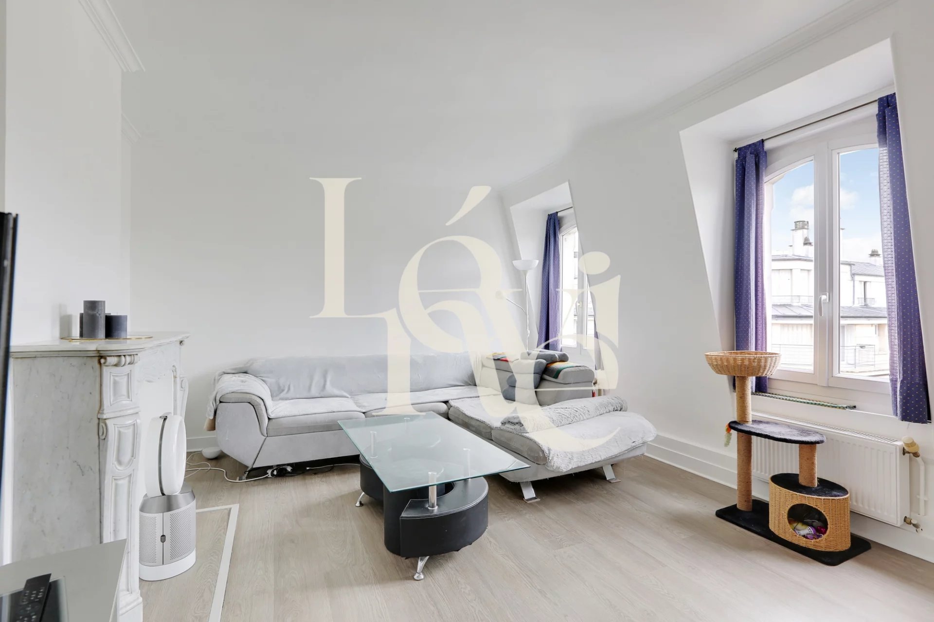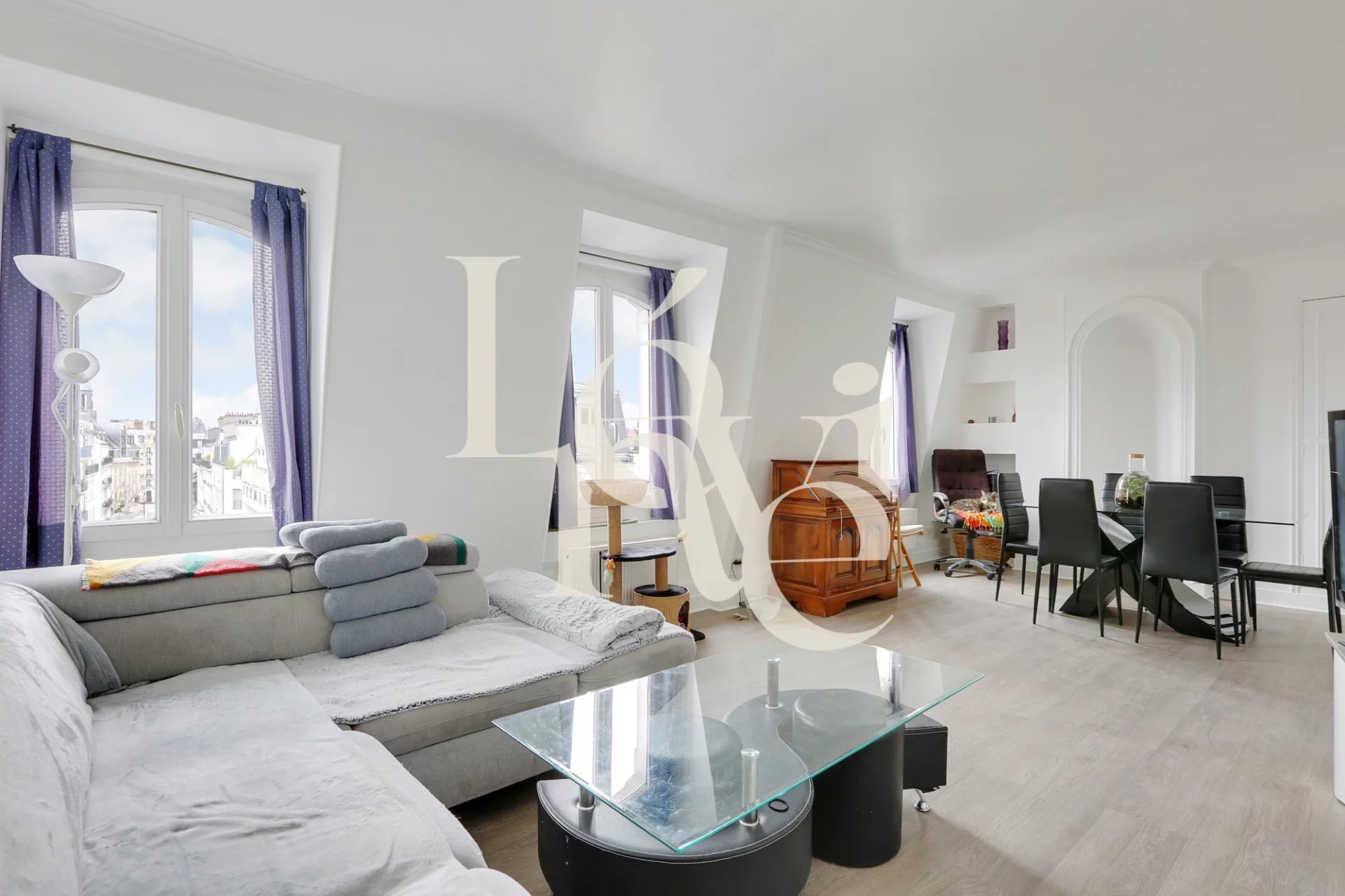 L’appartement se compose d’une entrée, d’un beau séjour exposé plein sud offrant une vue dégagée sur le ciel et les toits, d’une cuisine séparée et équipée, de deux chambres, d’une salle de bain et d’un WC indépendant